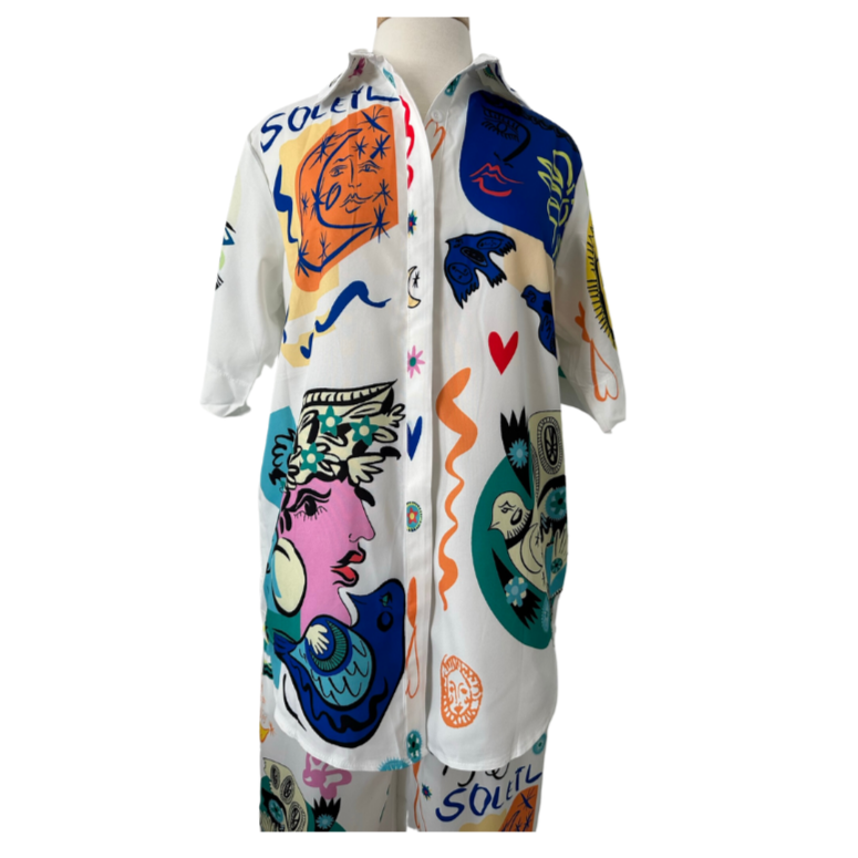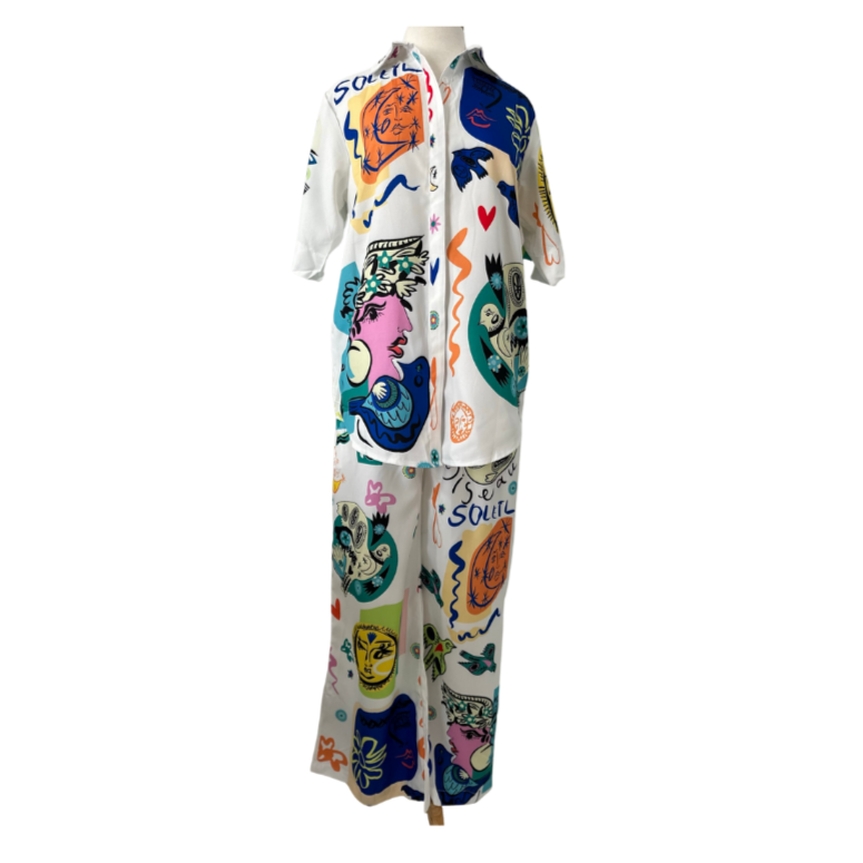 Designer inspo set is a shortsleeve button down top and long bottom in a soft fabric.