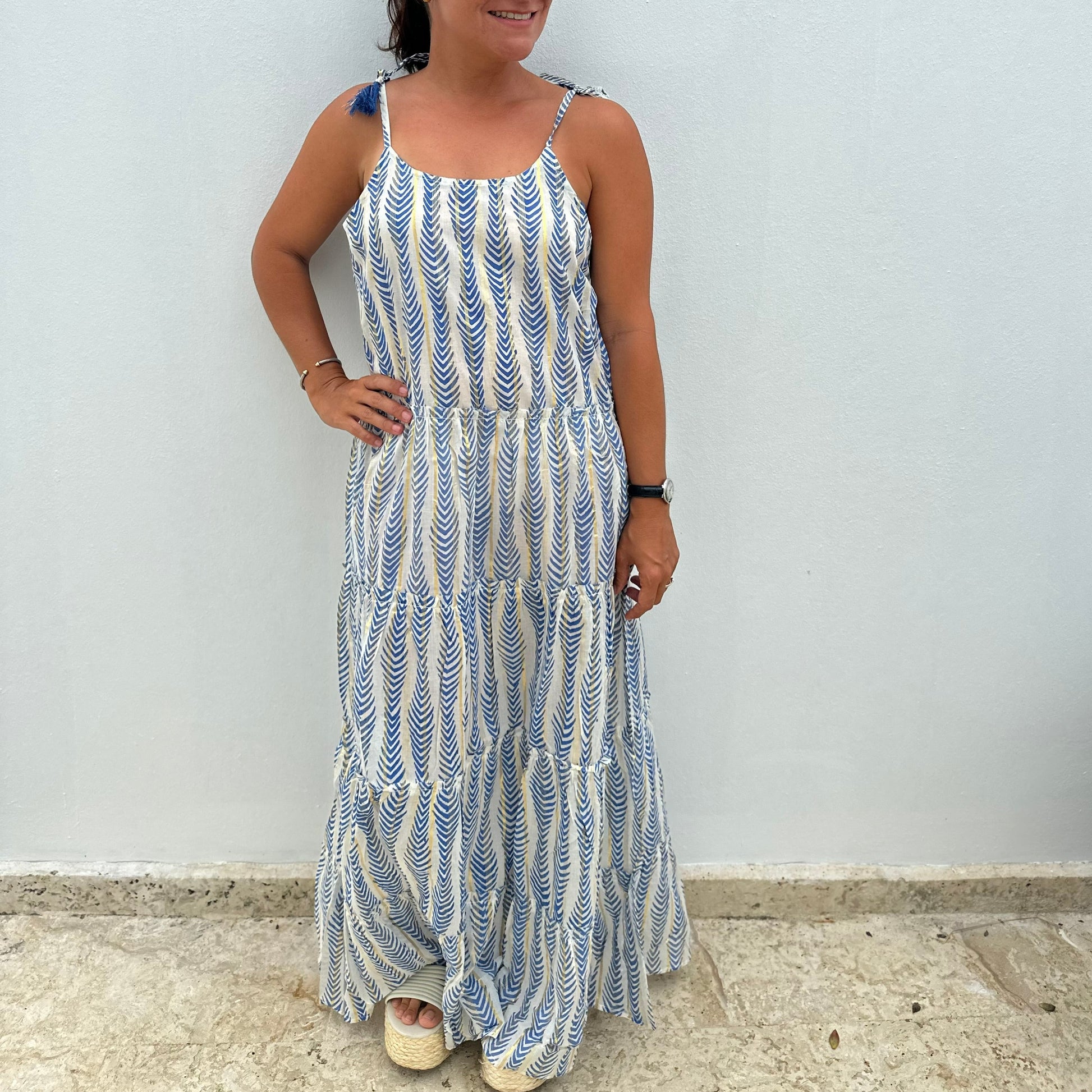 The Gianna Blue Maxi Dress combines elegance and comfort with a vibrant print inspired by coastal sunsets. Its flowy silhouette and plunging neckline make this a statement piece for warm evenings and island escapes.