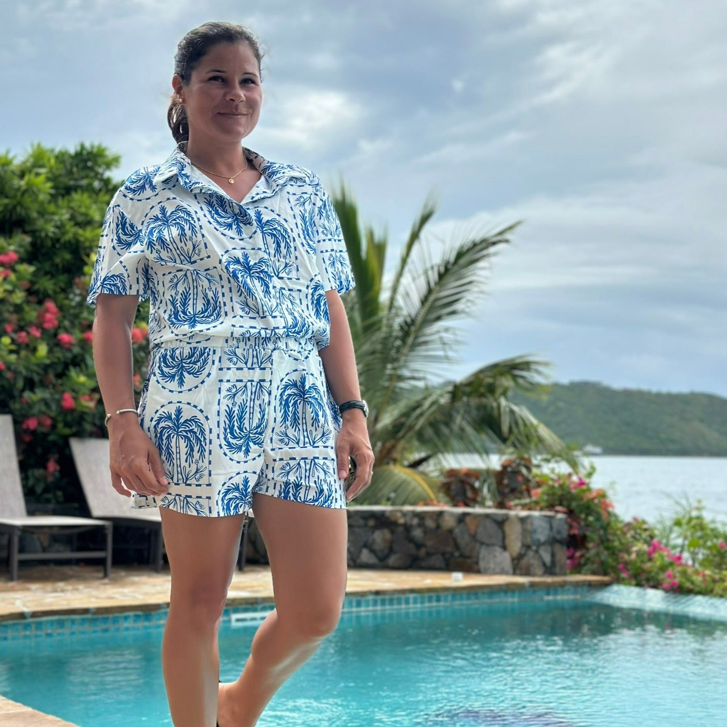 Let summer be painted in blue with our blouse and shorts set. Featuring a palm print in a shade of blue, this ensemble captures the essence of tranquil days by the sea. Perfect for a fresh and relaxed look. 🌿💙