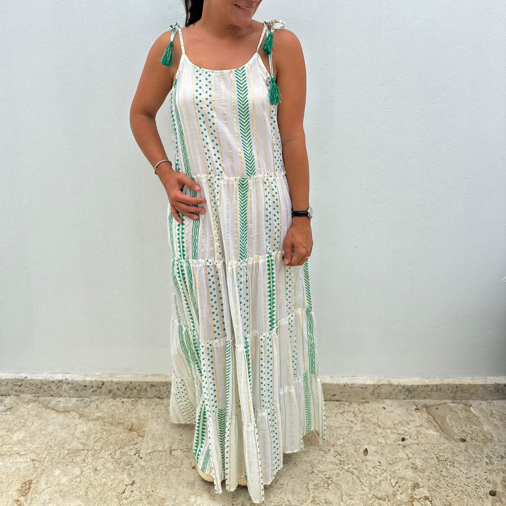 Green- Gold Maxi dress is a long dress with a tassels, invisible pockets and gold cotton lurex.