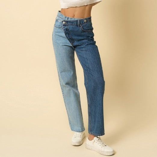 Embrace effortless style with our Crossover Straight Jeans, designed for those who love a blend of casual comfort and trend-forward fashion. Featuring a unique two-tone denim print, these jeans bring a fresh twist to your everyday wardrobe. The high-rise fit and straight silhouette provide a flattering, elongating effect, while the crossover design adds a distinctive embellishment. Finished with a classic button closure and a regular length, these jeans are perfect for adding a playful yet polished touch to any casual look.