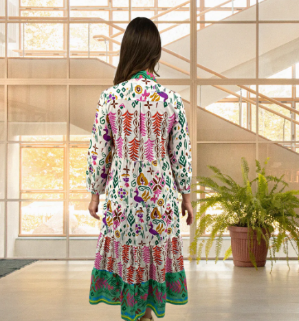 Lana long dress is made of breathable cotton with a luxury chinese collar, 3/4 sleeves and comfortable pockets in a very elegant dreamy print with bright colors.