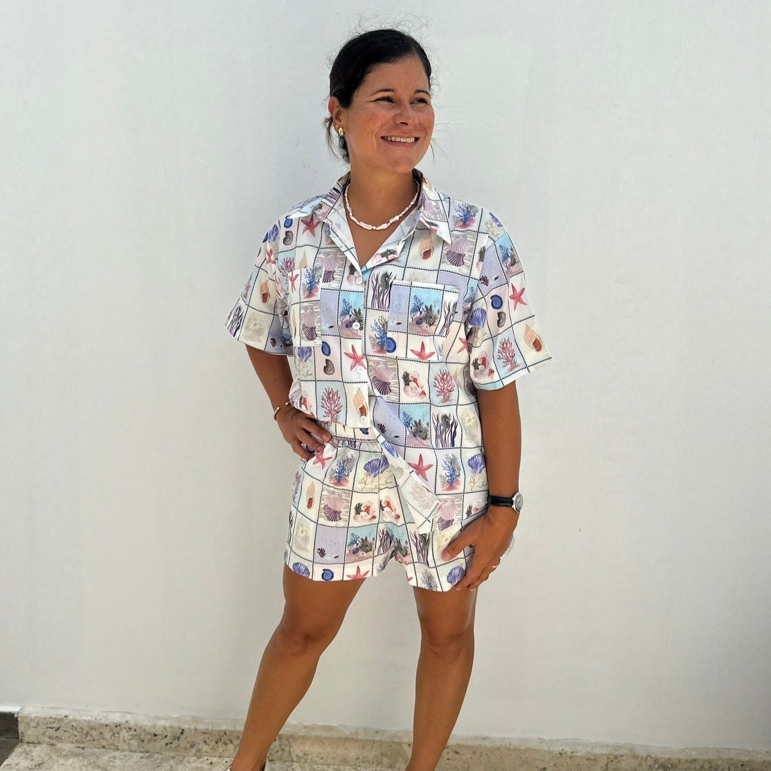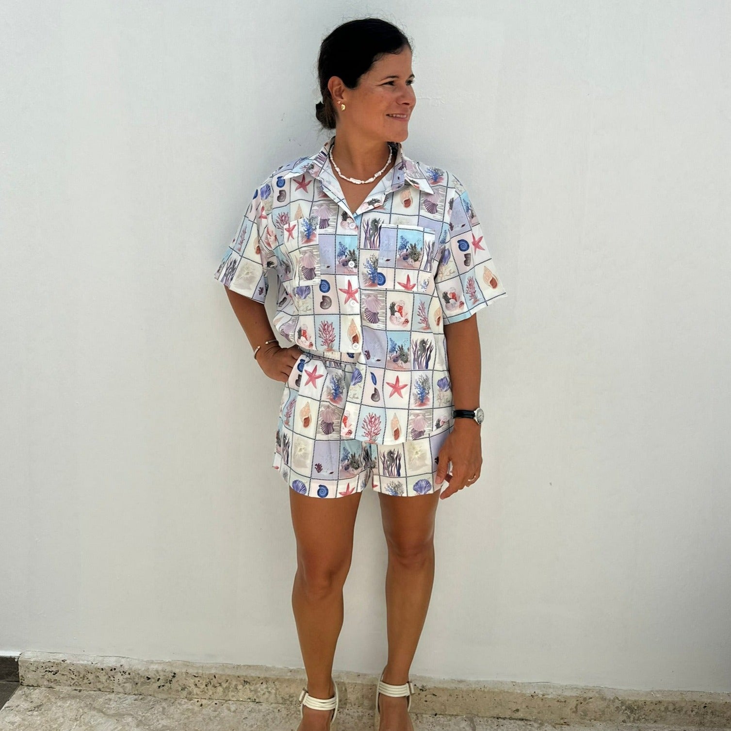 Dive into summer with our new shirt and short set featuring a whimsical print of sea stars, shells, and marine vegetation in a beautiful mix of white, pink, and lilac colors. This set effortlessly captures the essence of oceanic charm, making it perfect for beach outings or casual summer days. Embrace the serene and stylish vibe of the sea! 🌊🌸💜